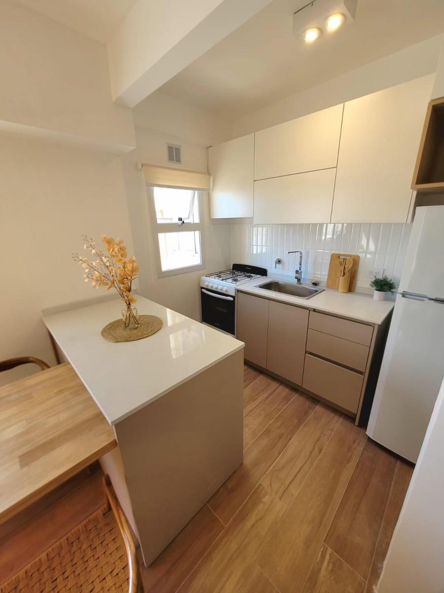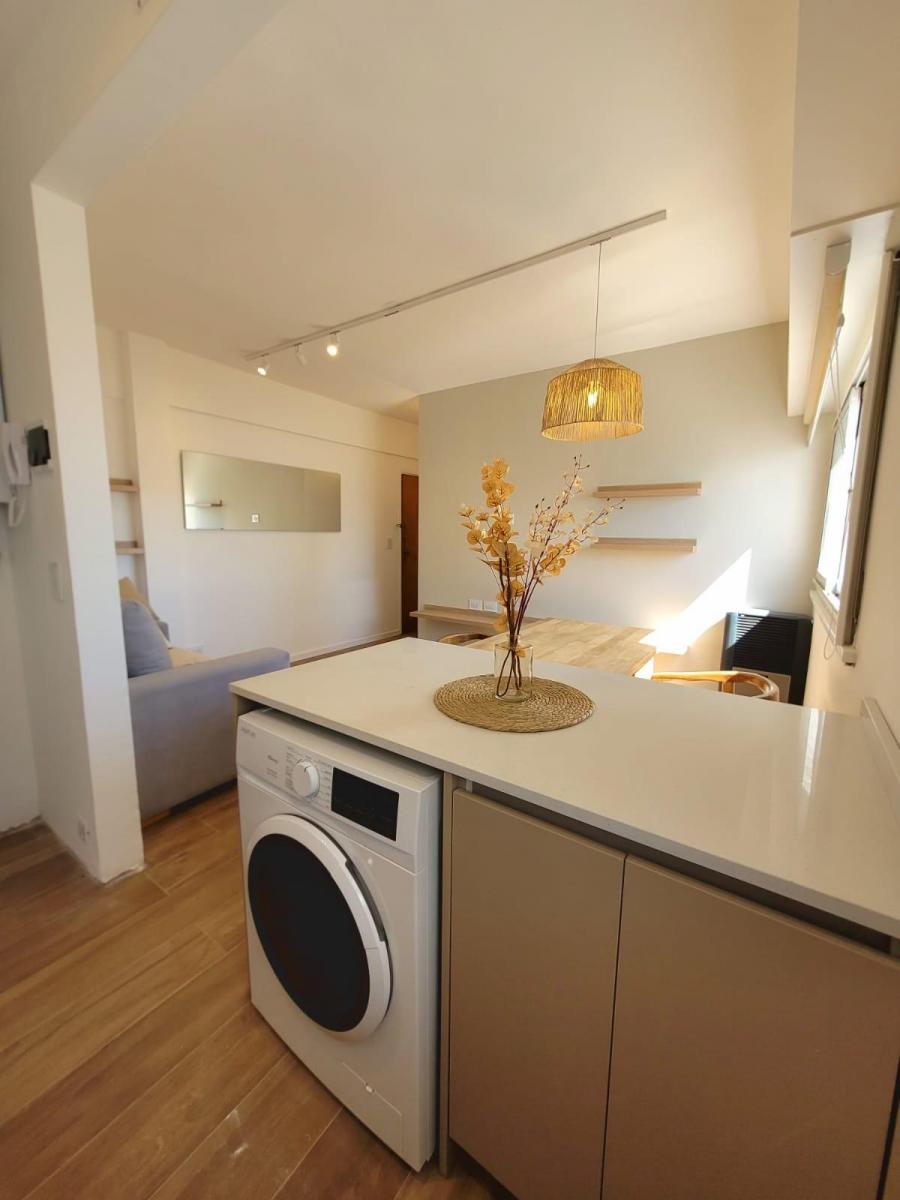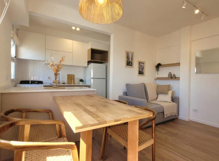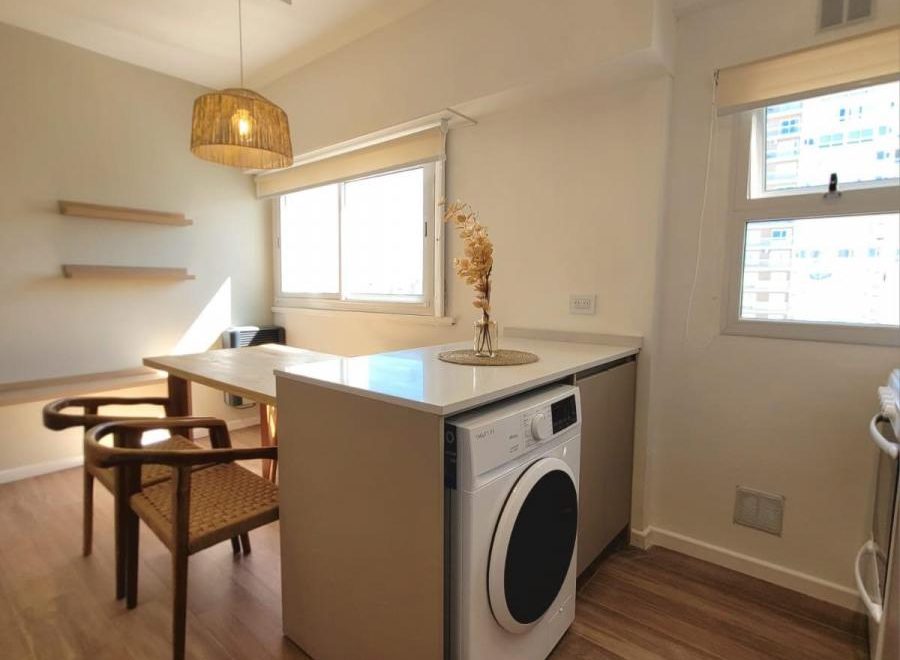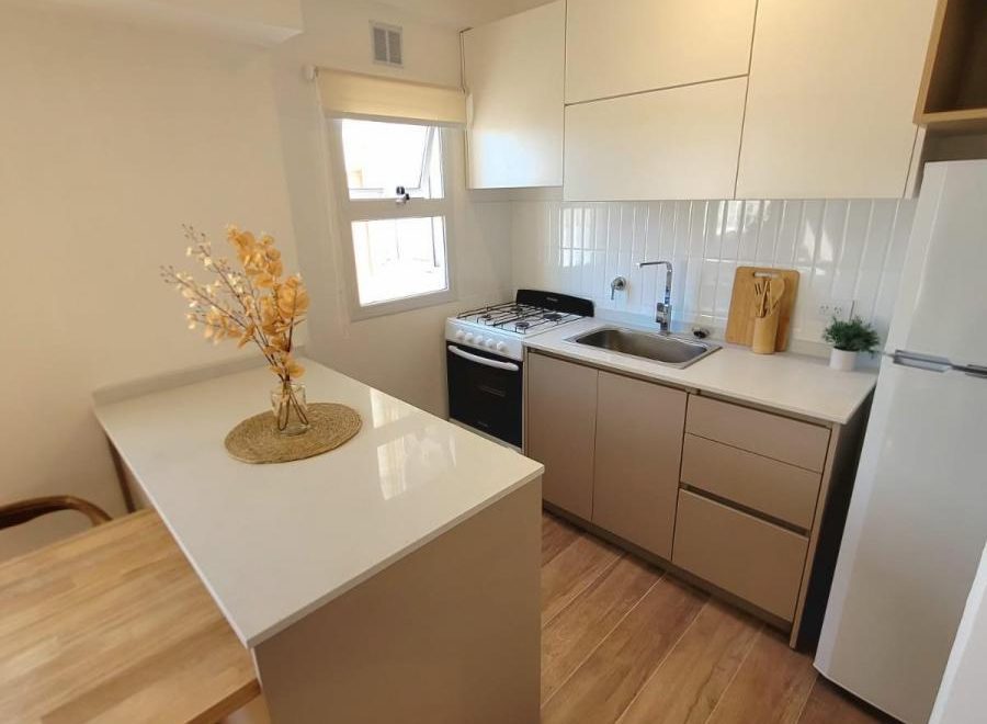 La unidad cuenta con living comedor muy soleado, con pisos de porcelanato y moderna isla en cuarzo, integrándose a una cocina completamente equipada, con amoblamiento a medida y electrodomésticos nuevos: heladera con freezer, lavarropas, cocina y calefón.