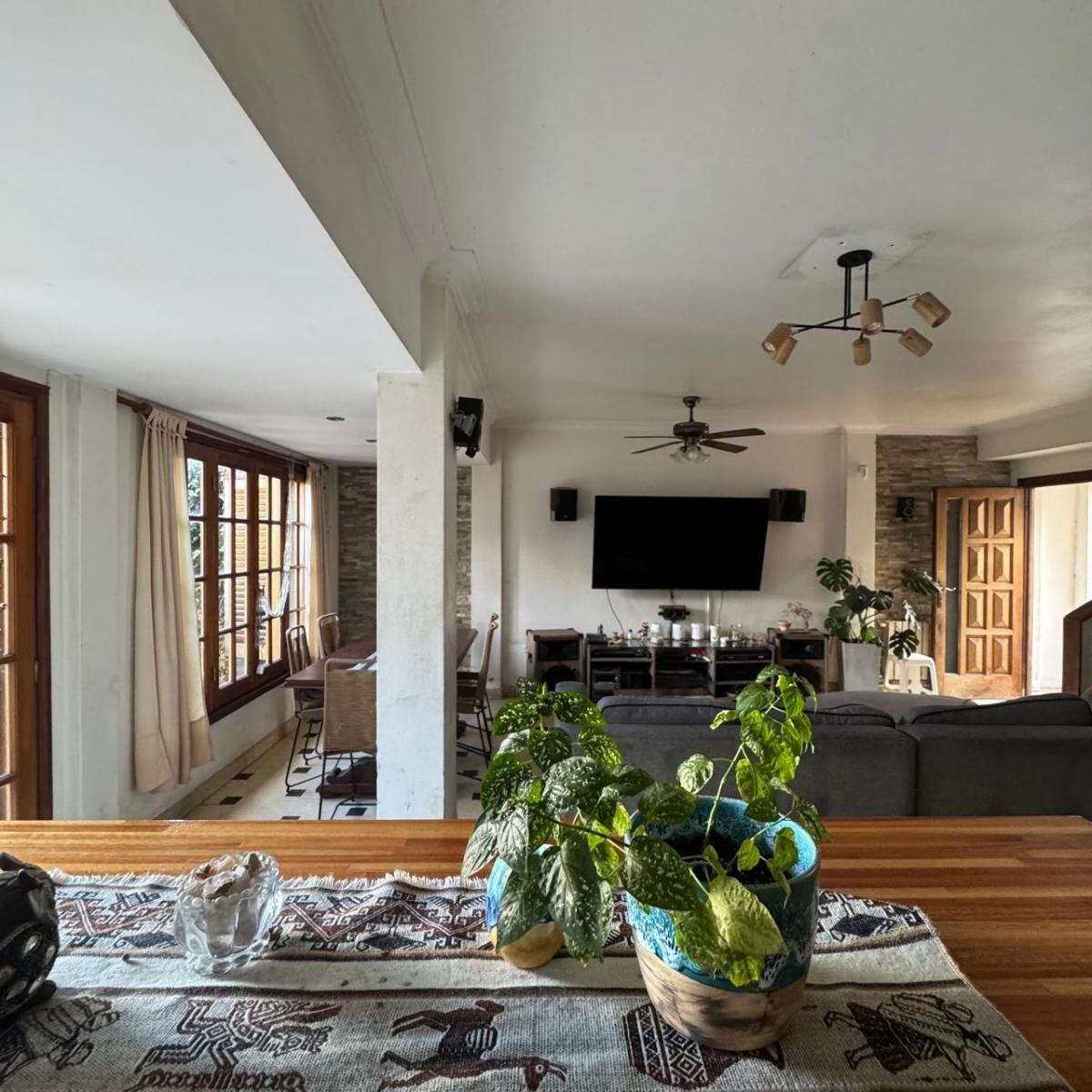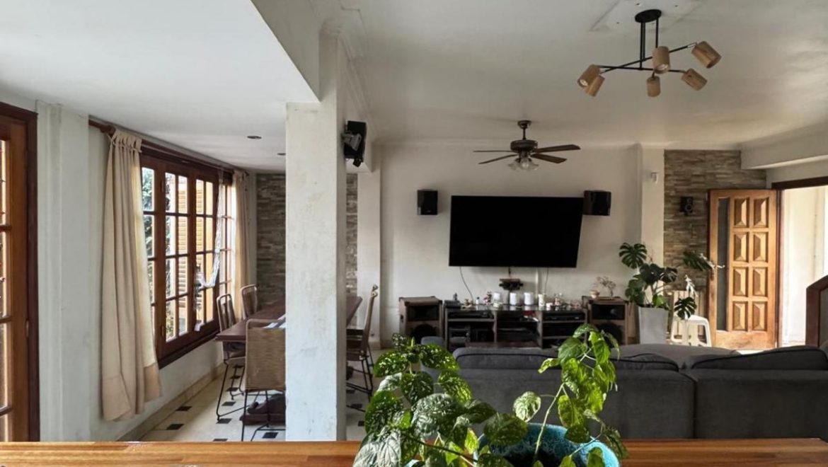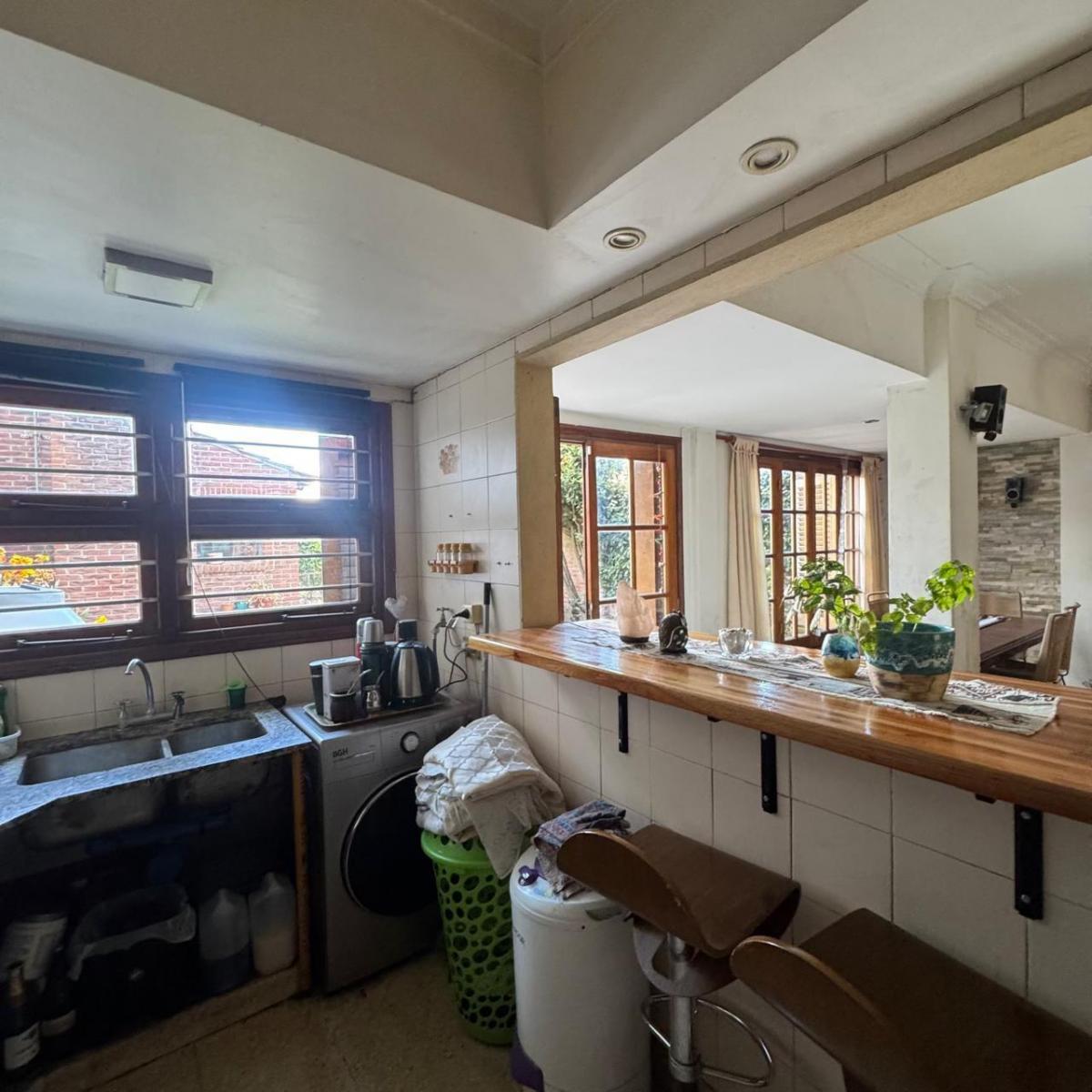 Gran living comedor con salida al parque y al quincho, amplia cocina integrada con barra desayunadora y vista al parque, dependencia y toilette, habitacion actualmente utilizada como estudio de musica.