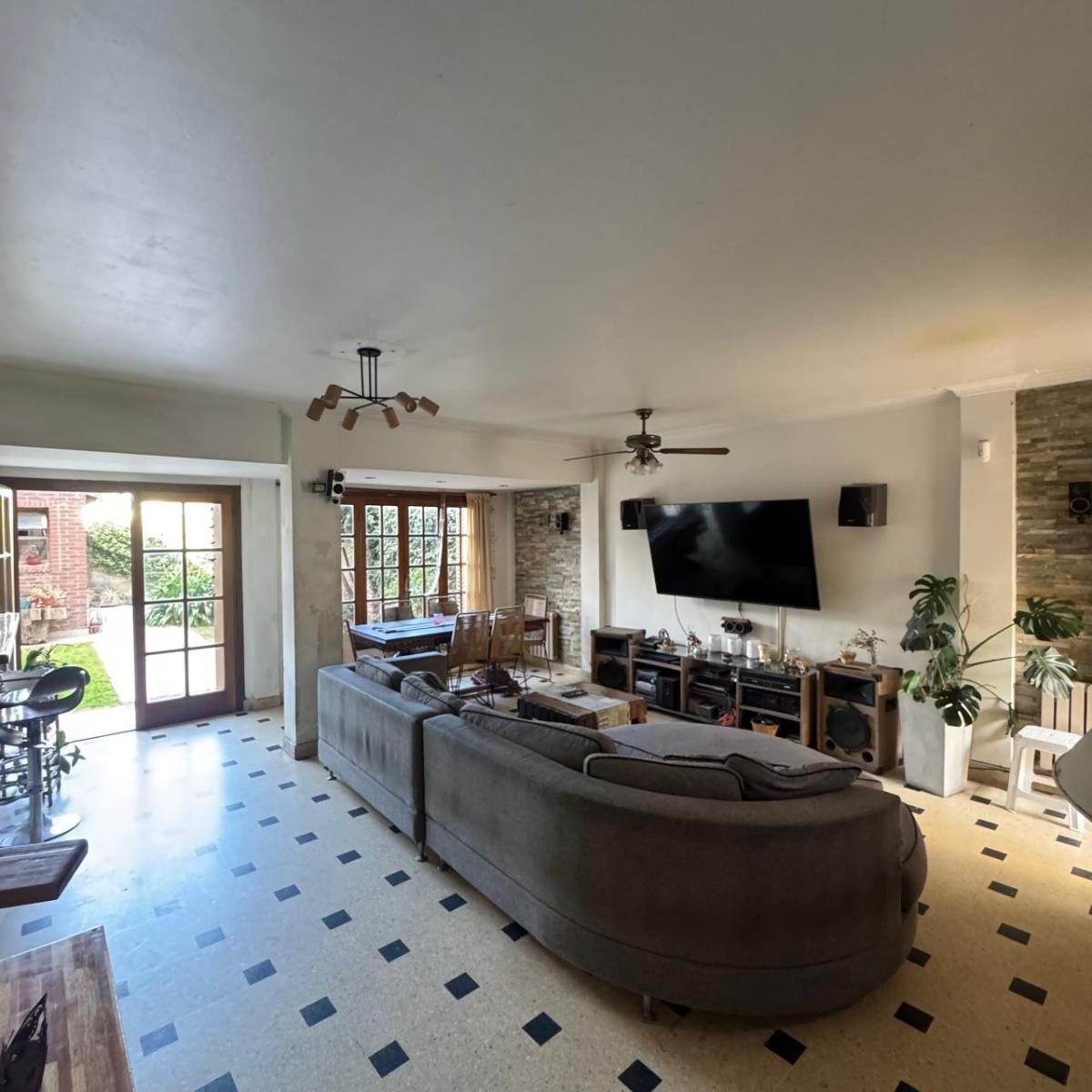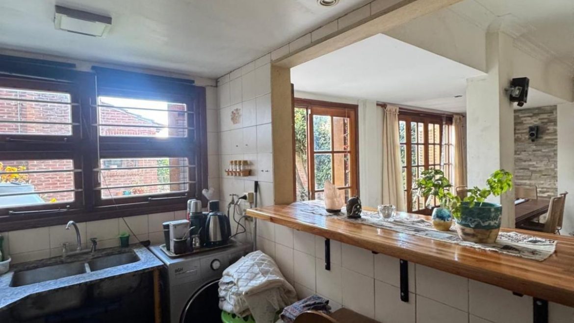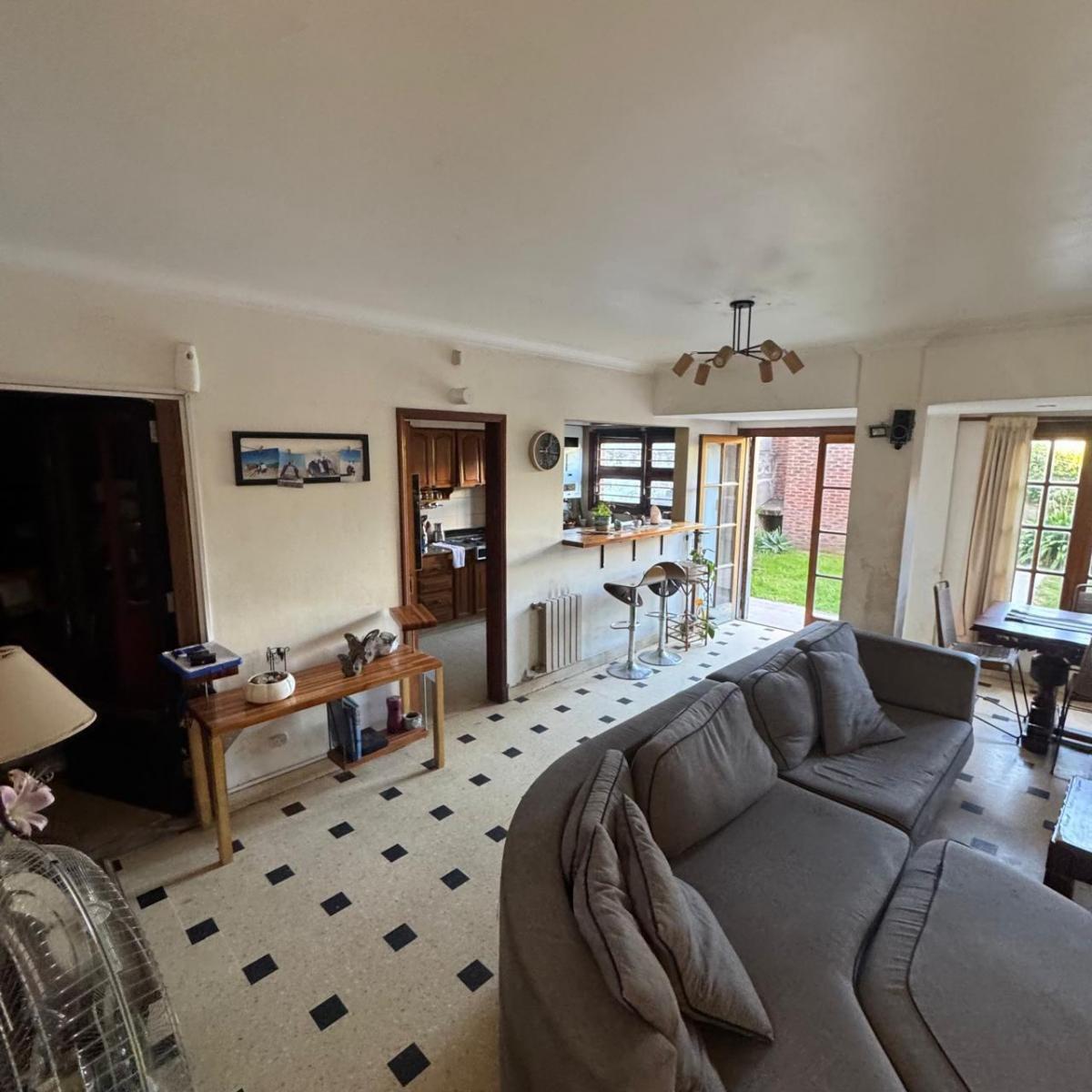 Gran living comedor con salida al parque y al quincho, amplia cocina integrada con barra desayunadora y vista al parque, dependencia y toilette, habitacion actualmente utilizada como estudio de musica.